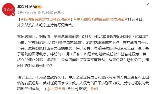 有记者提问,据报道,美国总统特朗普10月31日以“基督教在尼日利亚面临威胁”为由,宣布将尼列入“特别关注国家名单”。尼外交部发表声明称,美方说法与事实不符,尼将继续打击暴力极端主义,保护公民,尊重宗教信仰和多元包容,遵守基于规则的国际秩序。特朗普11月1日称,如尼政府继续放任杀害基督徒行为,美将立即停止对尼一切援助,很有可能对尼采取军事行动,消灭伊斯兰恐怖分子。请问中方对此有何评论?